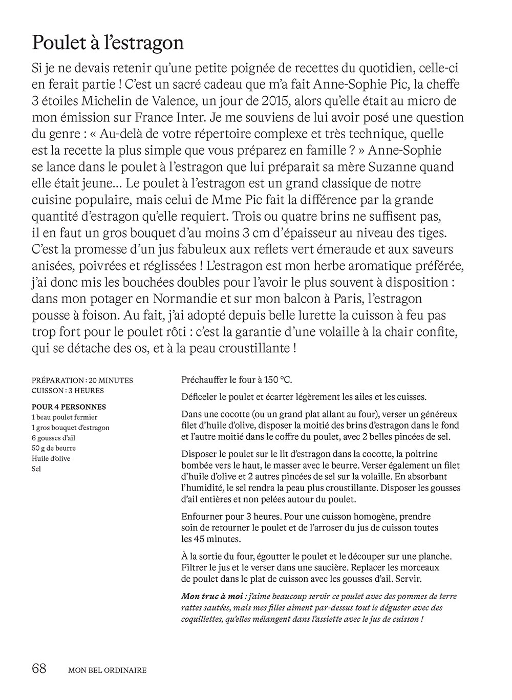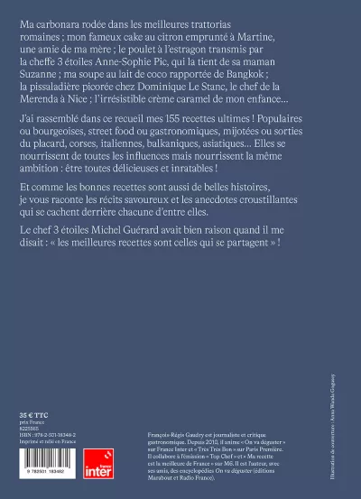 Ma carbonara rodée dans les meilleures trattorias romaines ; mon fameux cake au citron emprunté à Martine, une amie de ma mère ; le poulet à l’estragon transmis par la cheffe trois étoiles Anne-Sophie Pic, qui la tient de sa maman Suzanne ; ma soupe au lait de coco rapportée de Bangkok ; la pissaladière picorée chez Dominique Le Stanc, le chef de La Merenda à Nice ; l’irrésistible crème caramel de mon enfance… J’ai rassemblé dans ce recueil mes 155 recettes ultimes. Populaires ou bourgeoises, street food ou gastronomiques, mijotées ou sorties du placard, corses, italiennes, balkaniques, asiatiques… Elles se nourrissent de toutes les influences mais nourrissent la même ambition : être toutes délicieuses et inratables. Et comme les bonnes recettes sont aussi de belles histoires, je vous raconte les récits savoureux et les anecdotes croustillantes qui se cachent derrière chacune d’entre elles. Le chef trois étoiles Michel Guérard avait bien raison quand il me disait : « Les meilleures recettes sont celles qui se partagent ».