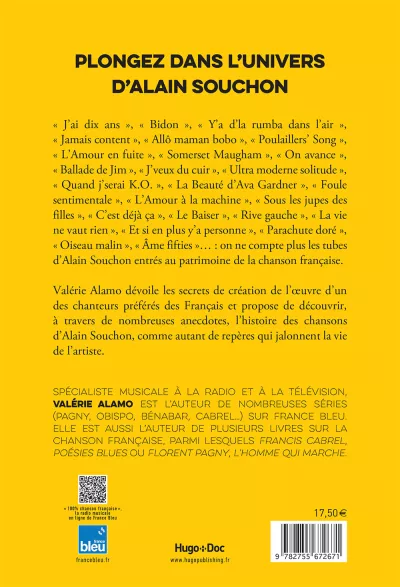 Dans ce livre, Valérie Alamo nous plonge dans l’univers d’Alain Souchon et dévoile des secrets de création de l’œuvre d’un des chanteurs préférés des Français. A travers de nombreuses anecdotes, elle nous propose de découvrir l’histoire des chansons d’Alain Souchon, comme autant de repères qui jalonnent la vie de l’artiste.