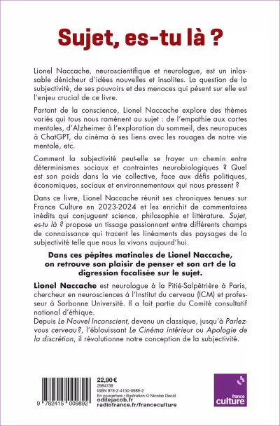 Dans ce livre, Lionel Naccache réunit ses chroniques Le Biais de Lionel Naccache tenues sur France Culture en 2023-2024 et les enrichit de commentaires inédits qui conjuguent science, philosophie et littérature. Sujet, es-tu là ? propose un tissage passionnant entre différents champs de connaissance qui tracent les linéaments des paysages de la subjectivité telle que nous la vivons aujourd’hui.