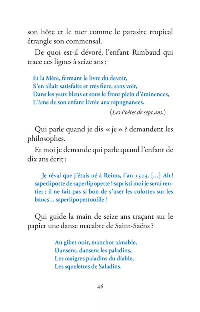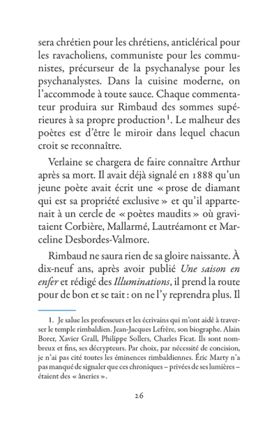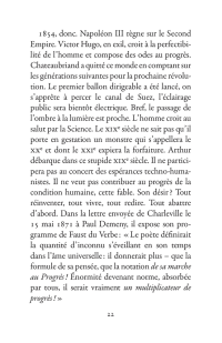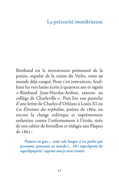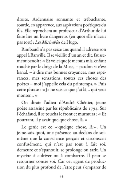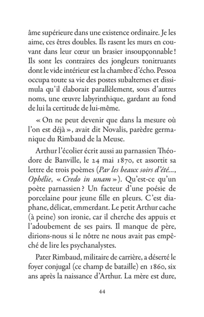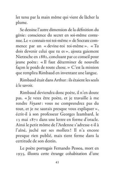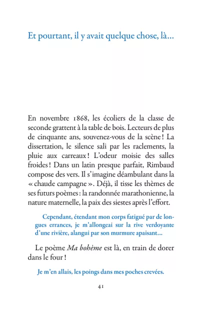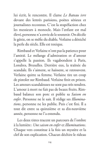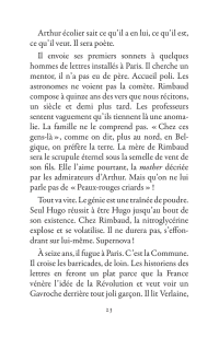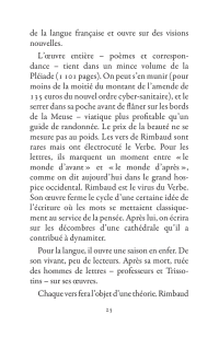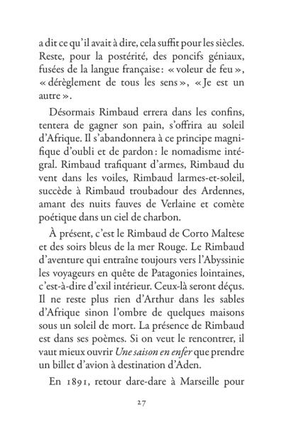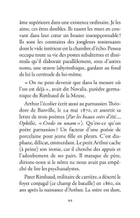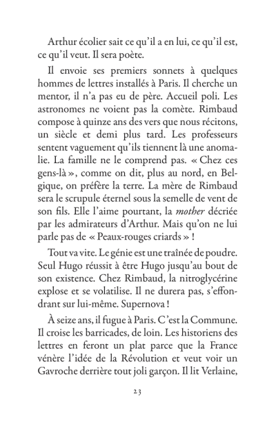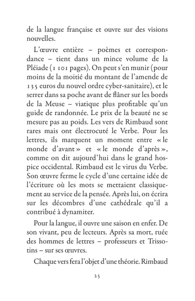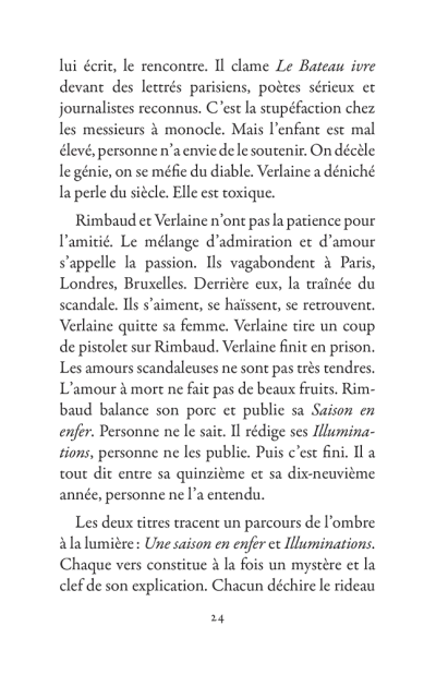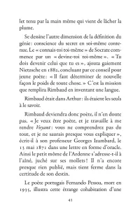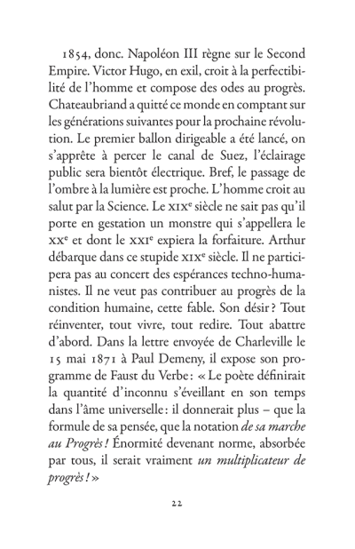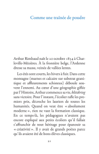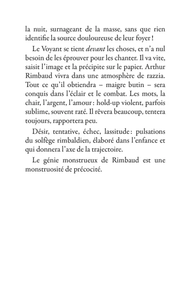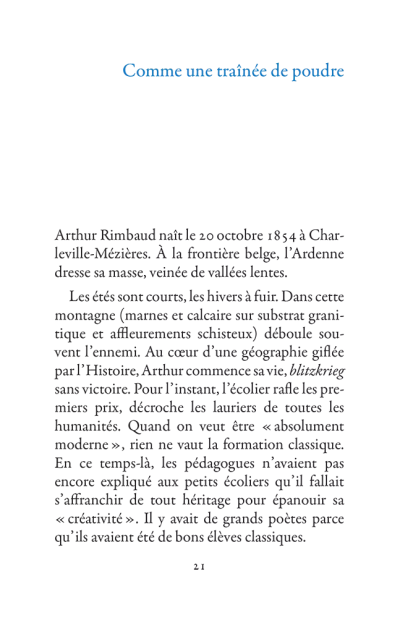 Il s’échappe hors de l’Ardenne, cavale dans la nuit parisienne, court après l’amour en Belgique, se promène à Londres puis s’aventure à mort sur les pistes d’Afrique. La poésie est le mouvement des choses. Rimbaud se déplace sans répit, changeant de point de vue. Son projet : transformer le monde par les mots. Ses poèmes sont des projectiles, des bouquets de feu : cent cinquante ans plus tard, ils nous atteignent encore.
