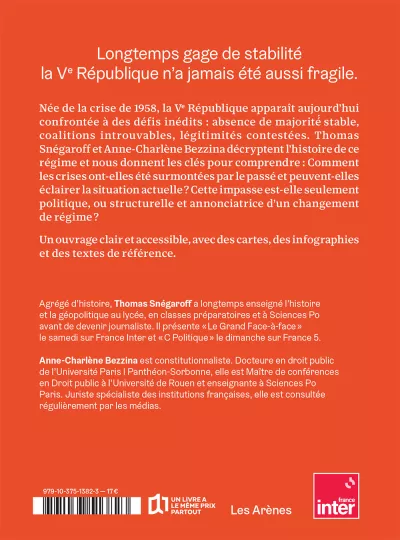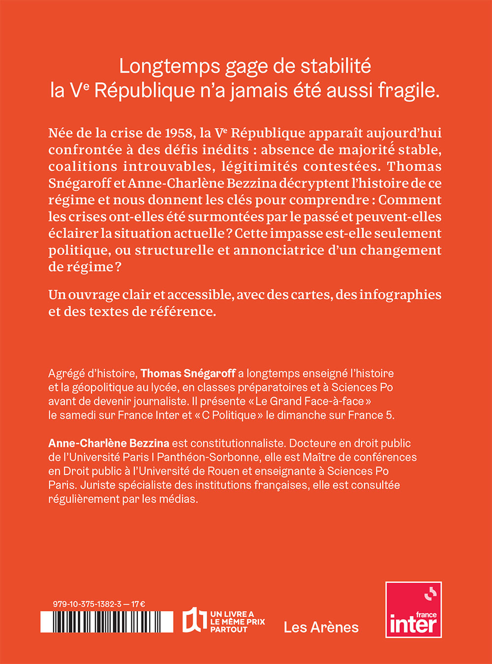 Née de la crise de 1958, la Ve République est aujourd’hui confrontée à des défis inédits. Dans cet ouvrage, l’histoire de la Ve est décryptée à travers six dates clefs. Comment les crises ont-elles été surmontées par le passé ? Peuvent-elles éclairer l’impasse actuelle ? Cette impasse est-elle seulement politique ou structurelle et annonciatrice d’un changement de régime ?