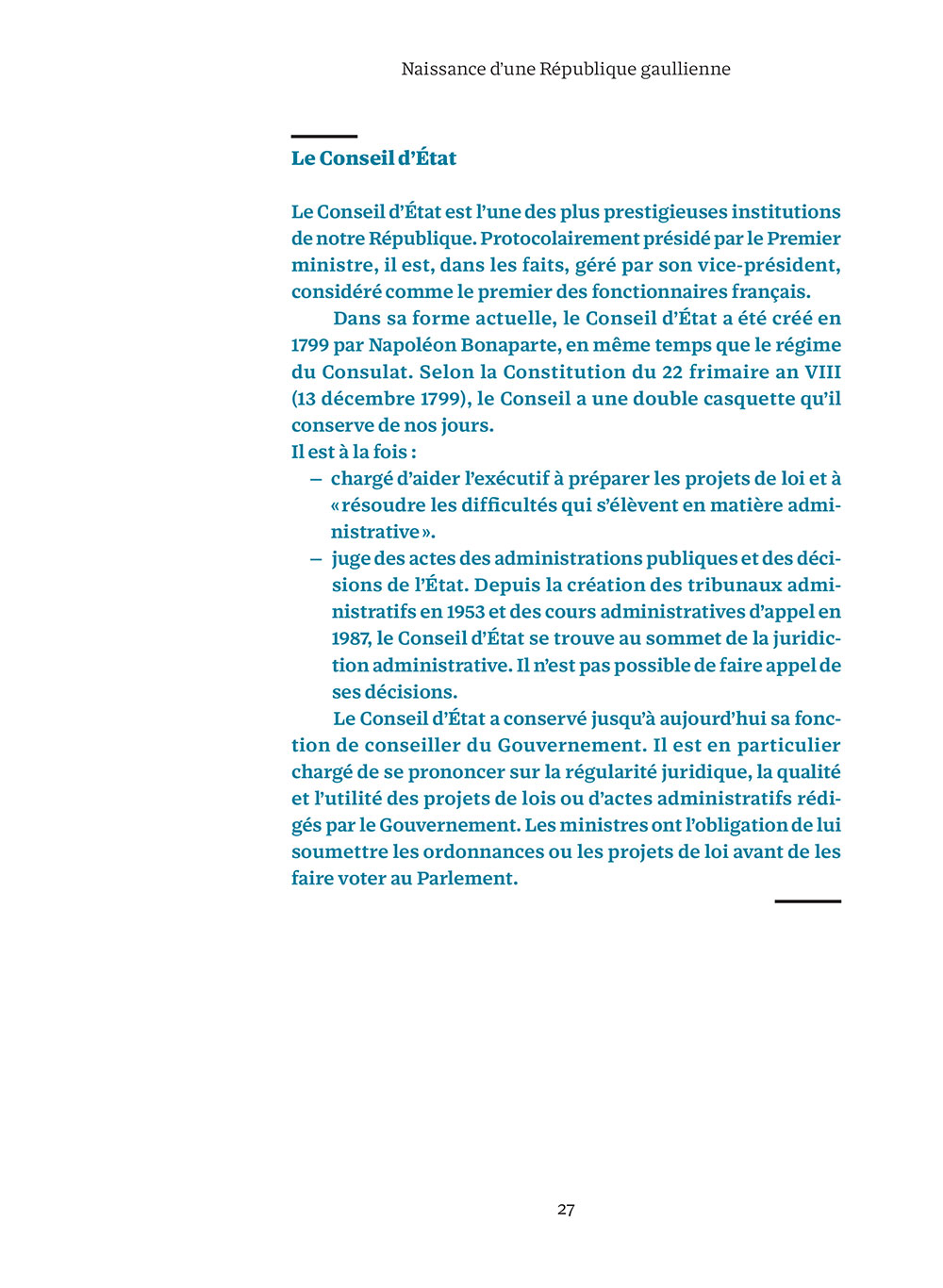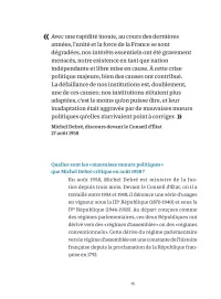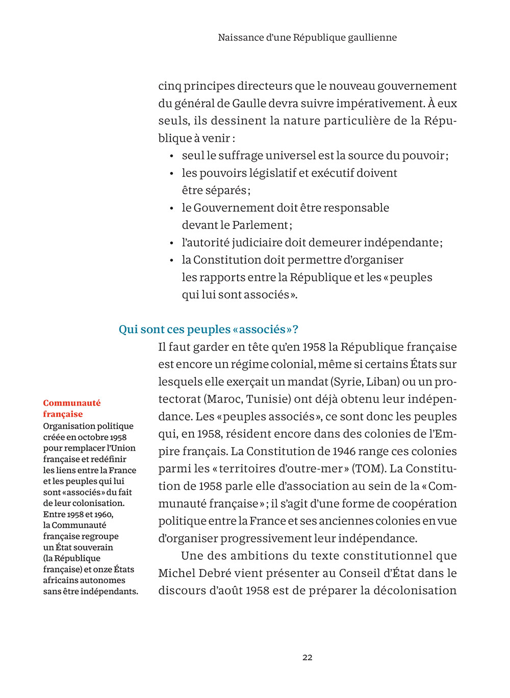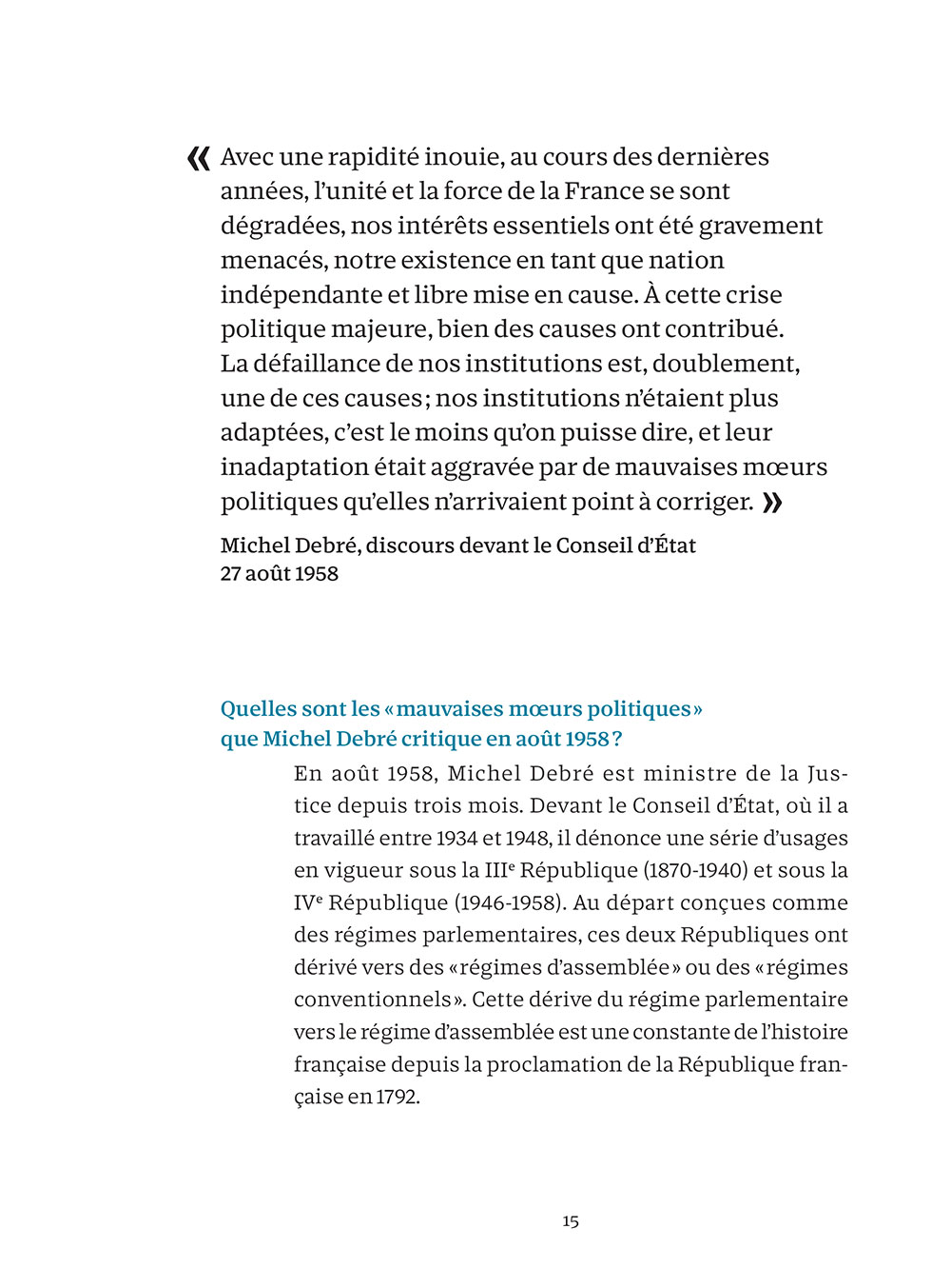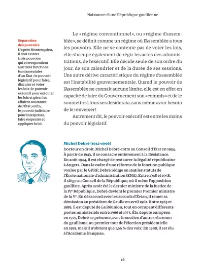 L’ouvrage est enrichi de définitions, d’extraits de discours, de biographies, indispensables pour comprendre le fonctionnement des institutions. Les infographies sont l’œuvre de Delphine Papin et les textes complémentaires de Lucie Rondeau du Noyer.