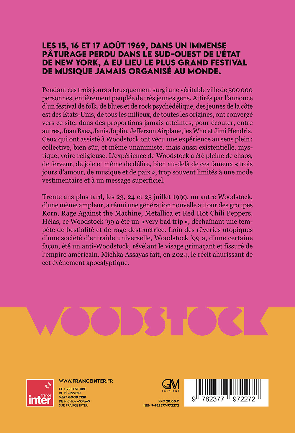 Trente ans plus tard, les 23, 24 et 25 juillet 1999, un autre Woodstock, d’une même ampleur, a réuni une génération nouvelle autour des groupes Korn, Rage Against the Machine, Metallica et Red Hot Chili Peppers. Hélas, ce Woodstock ‘99 a été un «very bad trip», déchaînant une tempête de bestialité et de rage destructrice. Loin des rêveries utopiques d’une société d’entraide universelle, Woodstock ’99 a, d’une certaine façon, été un anti-Woodstock, révélant le visage grimaçant et fissuré de l’empire américain. Michka Assayas fait, en 2024, le récit ahurissant de cet événement apocalyptique.