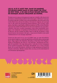 Les 15, 16 et 17 août 1969, dans un immense pâturage perdu dans le sud-ouest de l’État de New York, a eu lieu le plus grand festival de musique jamais organisé au monde. Pendant ces trois jours a brusquement surgi une véritable ville de 500 000 personnes, entièrement peuplée de très jeunes gens. Attirés par l’annonce d’un festival de folk, de blues et de rock psychédélique, des jeunes de la côte est des États-Unis, de tous les milieux, de toutes les origines, ont convergé vers ce site, dans des proportions jamais atteintes, pour écouter, entre autres, Joan Baez, Janis Joplin, Jefferson Airplane, les Who et Jimi Hendrix. Ceux qui ont assisté à Woodstock ont vécu une expérience au sens plein : collective, bien sûr, et même unanimiste, mais aussi existentielle, mystique, voire religieuse. L’expérience de Woodstock a été pleine de chaos, de ferveur, de joie et même de délire, bien au-delà de ces fameux « trois jours d’amour, de musique et de paix », trop souvent limités à une mode vestimentaire et à un message superficiel.