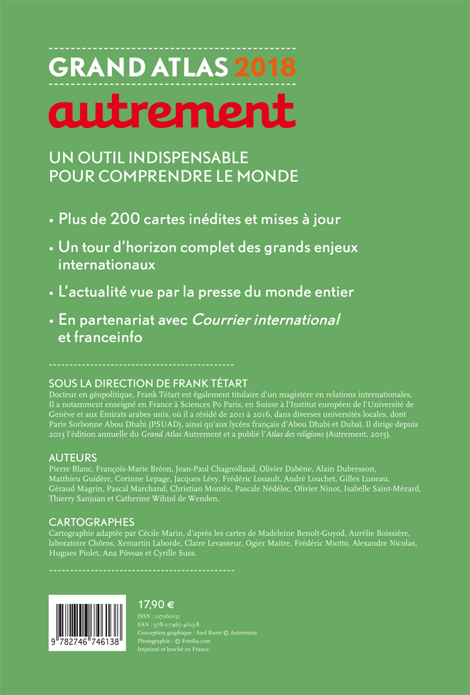 Grâce à l’analyse des plus grands spécialistes, ce Grand Atlas permet de comprendre les grands enjeux géopolitiques, politiques, économiques, sociaux et environnementaux mondiaux. Cette année, il se concentre sur la progression du populisme, notamment après la victoire de Trump aux États-Unis, l’Europe après le Brexit, la crise des migrants, la paix avec les FARC en Colombie, la révolution technologique en Afrique… mais aussi les tensions pour l’accès à l’eau ou la pollution des océans. Les frontières font également l’objet d’un dossier spécial autour de la tentation d’un repli protectionniste mondial. Cartes et infographies permettent de décrypter en un clin d’œil ces grandes questions d’actualité.