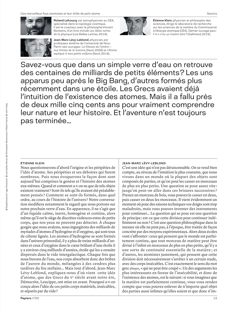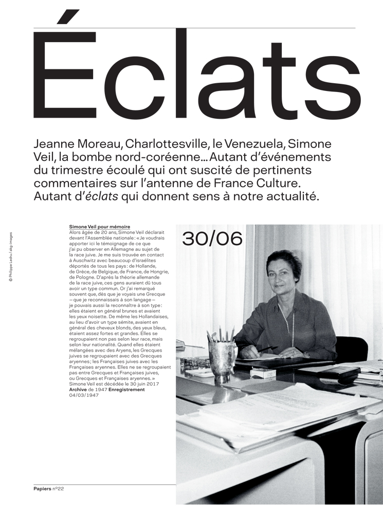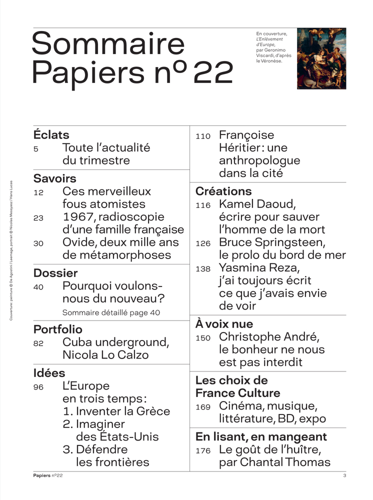 À découvrir également : un reportage dans l’Amérique côté Atlantique avec le « prolo » Bruce Springsteen, un plaidoyer pour l’engagement signé de la féministe Françoise Héritier, une réflexion inédite sur l’Europe face à la crise des migrants, par le politologue bulgare Ivan Krastev.