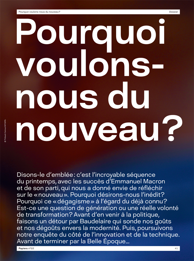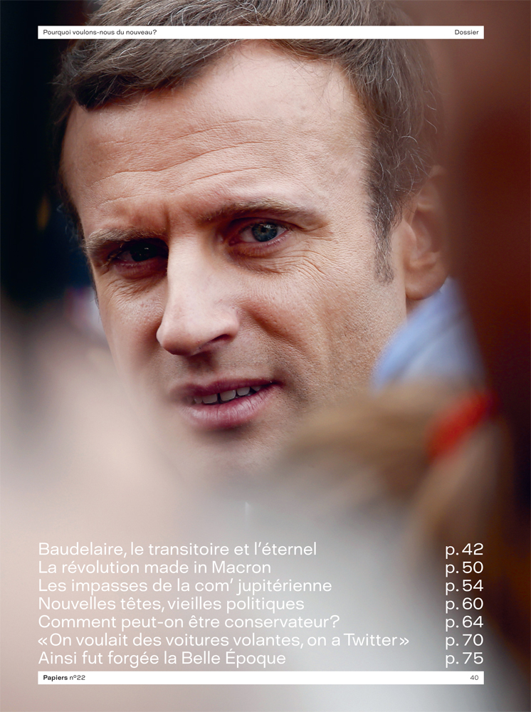 Au sommaire de ce numéro : « Pourquoi voulons-nous du nouveau ? », c’est l’incroyable séquence du printemps, avec les succès d’Emmanuel Macron et de son parti qui a guidé cette envie de réfléchir sur le « nouveau ». Pourquoi désirons-nous l’inédit ? Pourquoi ce « dégagisme » à l’égard du déjà connu ? Est-ce une question de génération ou une réelle volonté de transformation ?