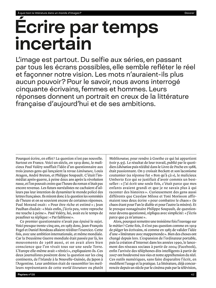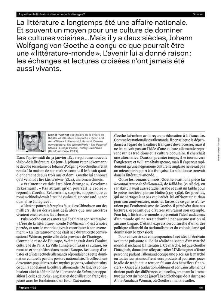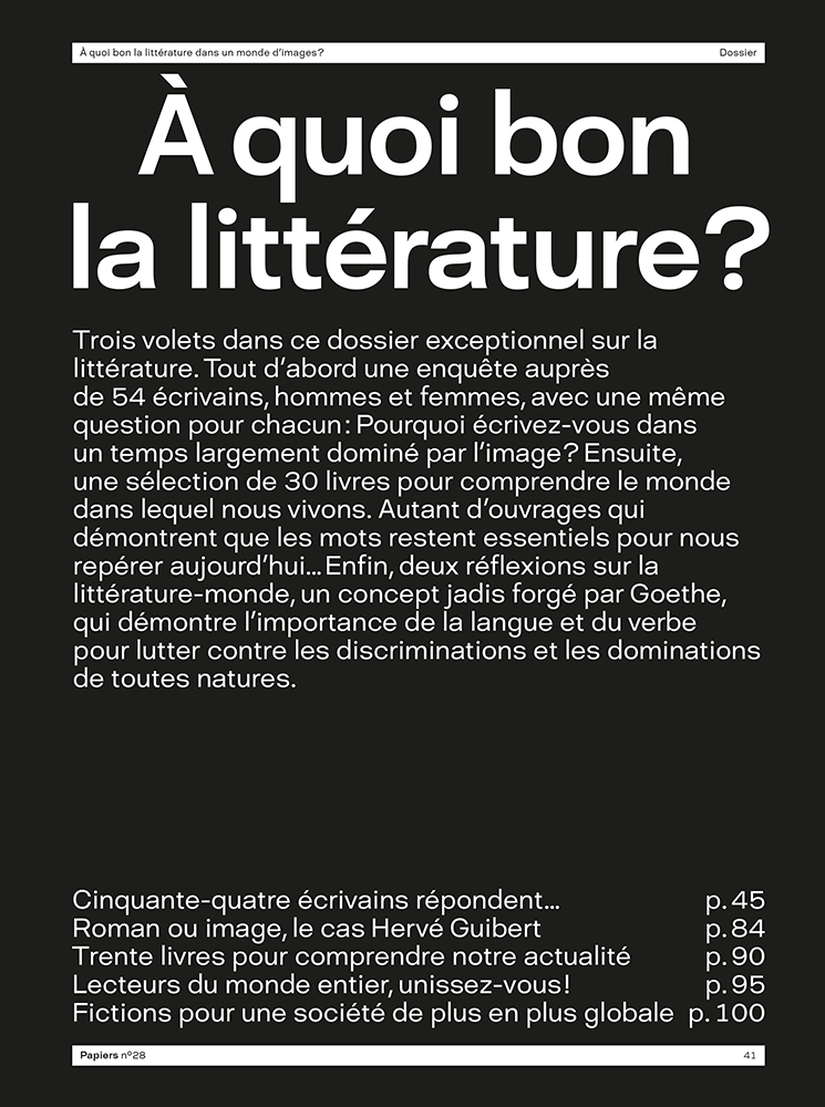 Tout d’abord une enquête auprès de 50 écrivains (H/F) avec une même question pour chacun : Pourquoi écrivez-vous dans un temps largement dominé par l’image ? Ensuite, une sélection de 30 livres pour comprendre le monde dans lequel nous vivons. Autant d’ouvrages qui démontrent que les mots restent essentiels pour nous repérer aujourd’hui… Enfin, deux réflexions sur la littérature-monde, un concept jadis forgé par Goethe, qui démontre l’importance de la langue et du verbe pour lutter contre les discriminations et les dominations de toutes natures…