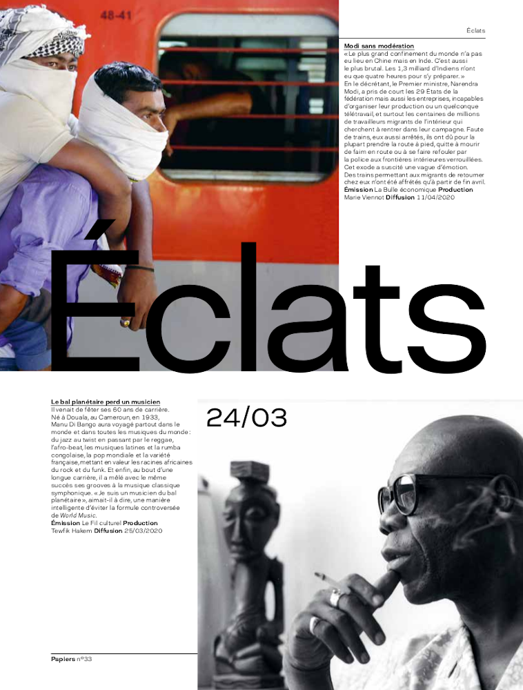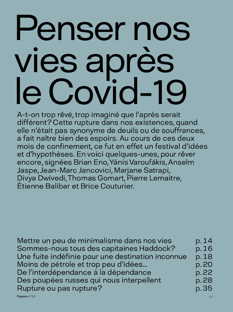 Autre dossier : Que seront nos vies après le Covid-19 ? Avec les réflexions du musicien Brian Eno, de Thomas Gomart, d’Étienne Balibar, de Marjane Satrapi et de bien d’autres.