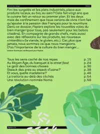 À lire dans ce numéro d’été, un grand dossier sur l’art du bien manger : exploration des nouvelles voies de la cuisine (pour tous, pas seulement pour les bobos citadins), en compagnie de grands chefs, avec des réflexions sur les produits et les nouveaux « interdits » (la viande, le gluten).