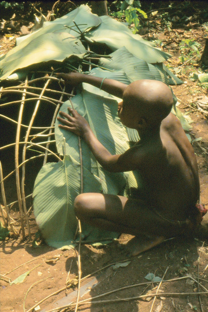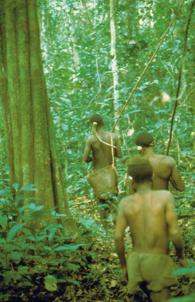 Il y a peu de temps encore, ces Pygmées étaient nomades, vivant dans la grande forêt équatoriale et n’en sortant qu’épisodiquement pour pratiquer le troc avec les Africains des villages alentour (troc de gibier contre du sel et du métal) ; la forêt subvenant à tous leurs autres besoins : vêtements en écorces d’arbres frappées, nourriture due à la chasse, à la petite pêche et à la collecte (fruits, racines, baies, miel et chenilles), habitat en petites huttes faites de branchages et couvertes de grandes feuilles.
