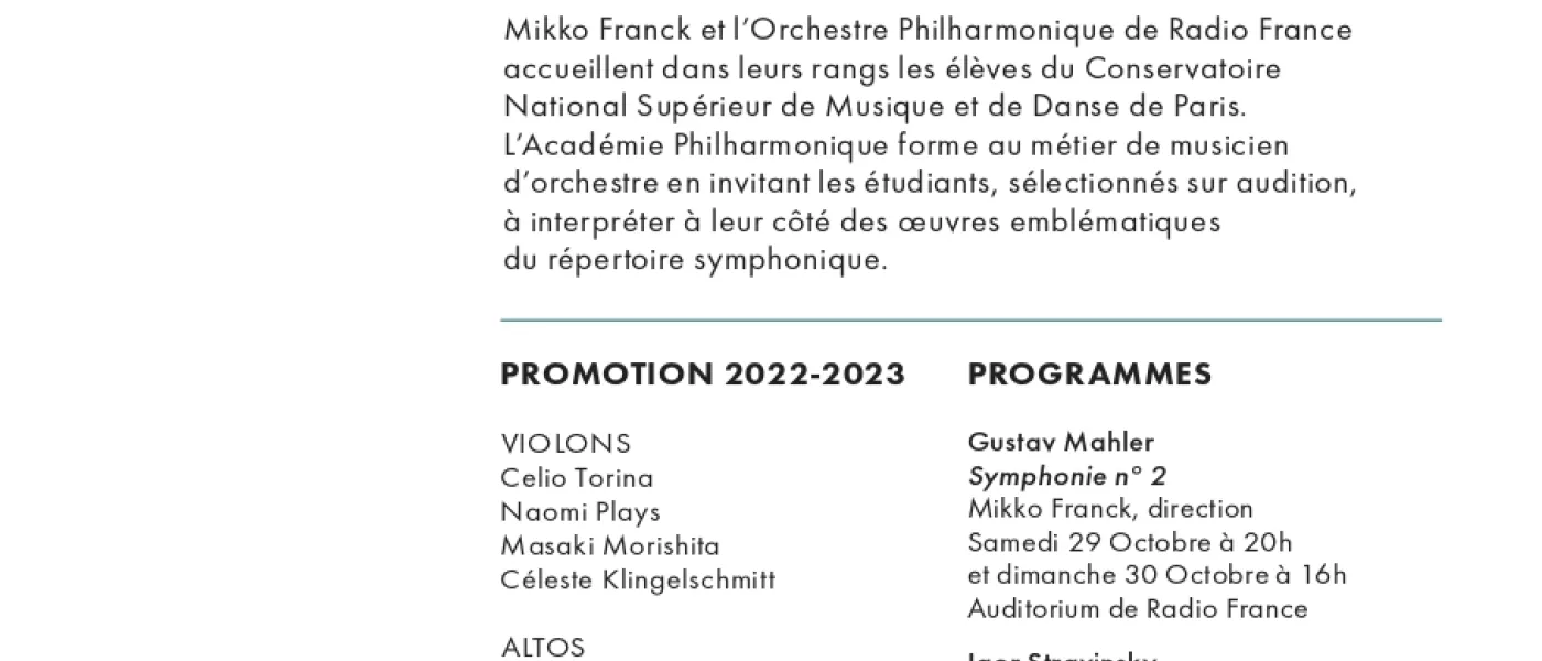 Des élèves du Conservatoire National Supérieur de Musique et de Danse de Paris sont accueillis par l’Orchestre Philharmonique de Radio France pour confirmer leur apprentissage du métier de musicien d'orchestre.