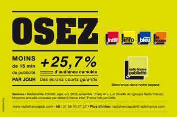 Commercialisant les espaces publicitaires (spots classiques et parrainage) de France Inter, France Info, France Bleu et le Mouv’, Radio France Publicité se positionnait depuis plusieurs années sur « l’espace préservé », mettant ainsi prioritairement en avant la qualité de ses espaces publicitaires.Radio France Publicité franchit aujourd’hui une nouvelle étape avec « Bienvenue dans notre espace ».
