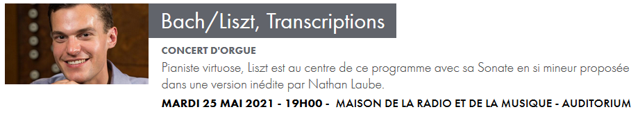 NICOLAUS BRUHNS / Praeludium en mi mineur JOHANN SEBASTIAN BACH / Fantaisie et Fugue chromatique BWV 903 (transcription Max Reger) KAROL BEFFA / Ciels brouillés (commande de Radio France – création mondiale) FRANZ LISZT / Sonate pour piano en si mineur (transcription Nathan Laube)