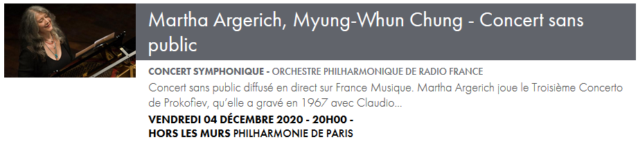 Du 1er au 15 décembre, les enregistrements continuent et les antennes de Radio France, France Musique, France Inter et ARTE Concert diffusent en direct ou en différé les concerts des formations musicales de Radio France donnés sans public.