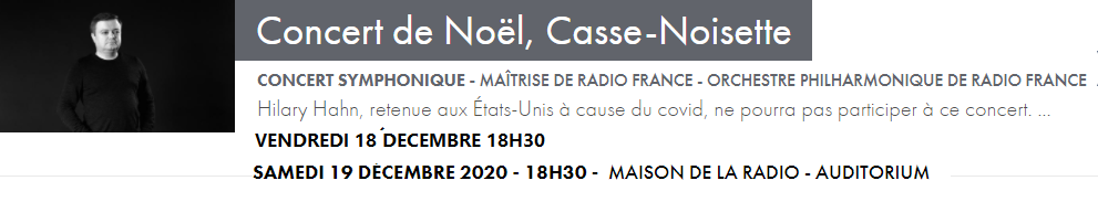 Afin de permettre au public de respecter le couvre-feu, les concerts prévus initialement à 20h sont déplacés à 18h30 (sauf les concerts du 18 décembre au Théâtre des Champs-Elysées et le concert du 31 décembre à l’Auditorium de Radio France).
