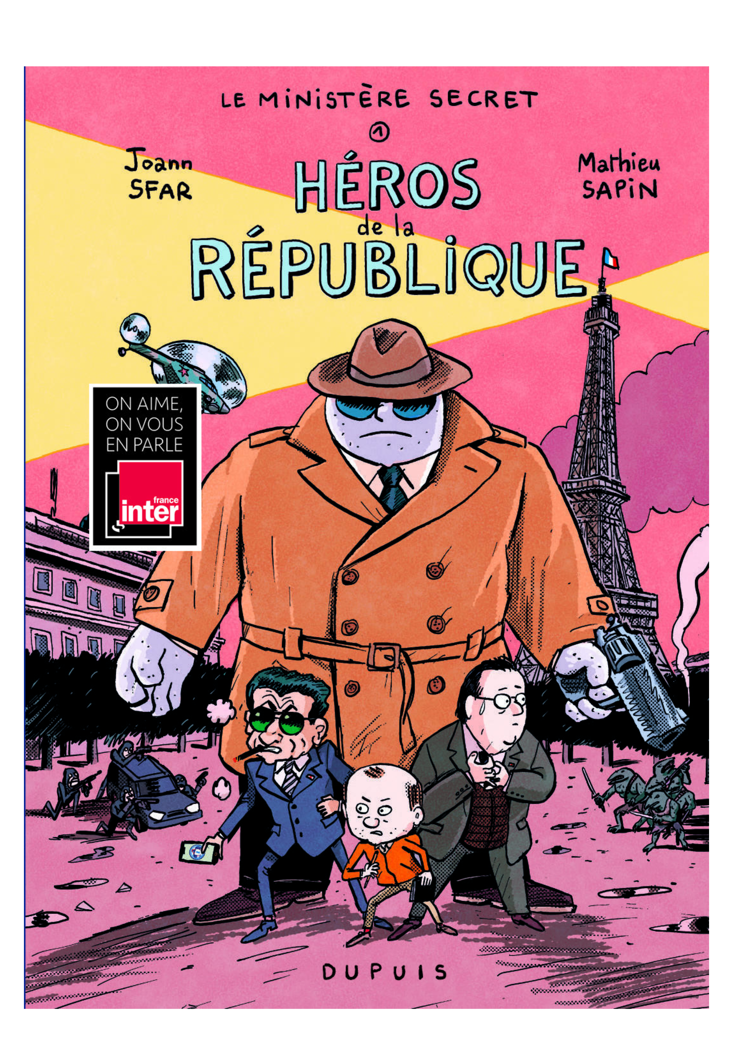 Mathieu Sapin Toujours inclassable et inattendu, Mathieu Sapin a également réalisé une comédie dans les arcanes de la politique avec Le Poulain (2018), participé à la série Sardine de l’espace (avec Emmanuel Guibert), signé le scénario de Paulette Comète pour Christian Rossi et ceux de Les Rêves dans la maison de la sorcière et La Planète aux cauchemars, variations lovecraftiennes réalisées avec Patrick Pion. En 2021, Mathieu Sapin débarque en force aux Éditions Dupuis avec la série Le Ministère secret. En compagnie de Joann Sfar, il y raconte les aventures de super-héros un brin spéciaux, puisqu’il s’agit des anciens Présidents François Hollande et Nicolas Sarkozy ! Entre humour et géopolitique, entre Le Bureau des légendes et Avengers, Sapin fait feu de tout son imaginaire pour nous offrir une saga pétillante, surprenante et inclassable, pré publiée dans le journal Spirou, magazine pour lequel il avait déjà signé de nombreuses planches et animations.