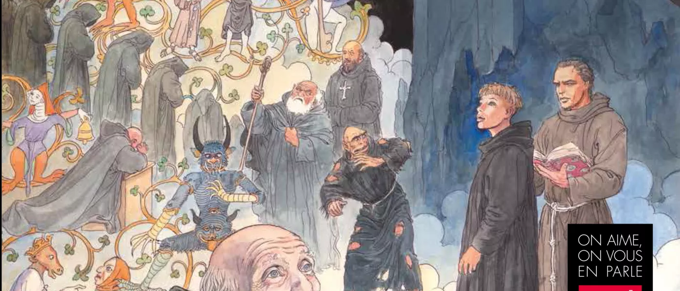 Milo Manara s’attelle à l’adaptation en deux tomes du chef d’œuvre d’Umberto Eco, vendu à plusieurs millions d’exemplaires et traduit en 43 langues. Après Jean-Jacques Annaud au cinéma (1986), c’est un nouvel artiste de prestige qui s’empare du célébrissime polar médiéval. À la demande des héritiers Eco, Manara a eu carte blanche pour donner sa vision de l’œuvre, et a pour cela choisi un triple parti pris graphique très audacieux. Son adaptation s’ouvre en effet sur Umberto Eco lui-même s’adressant au lecteur, dessiné dans un noir et blanc classique. Puis commence l’intrigue médiévale elle-même, et là Manara renoue avec le noir et blanc au lavis, rehaussé d’effets de matières et de modelés qu’il a déjà utilisé pour Le Caravage. Enfin, chacun sait que les livres tiennent un rôle fondamental dans l’intrigue, et Manara s’amuse donc de temps à autre à recréer des enluminures d’époque, réalisées à la manière des moines copistes du Moyen Âge. L’ensemble est mis en couleurs par la propre fille de Manara sous la supervision de son père, là aussi selon la même méthode qui a présidé à la réalisation du Caravage.