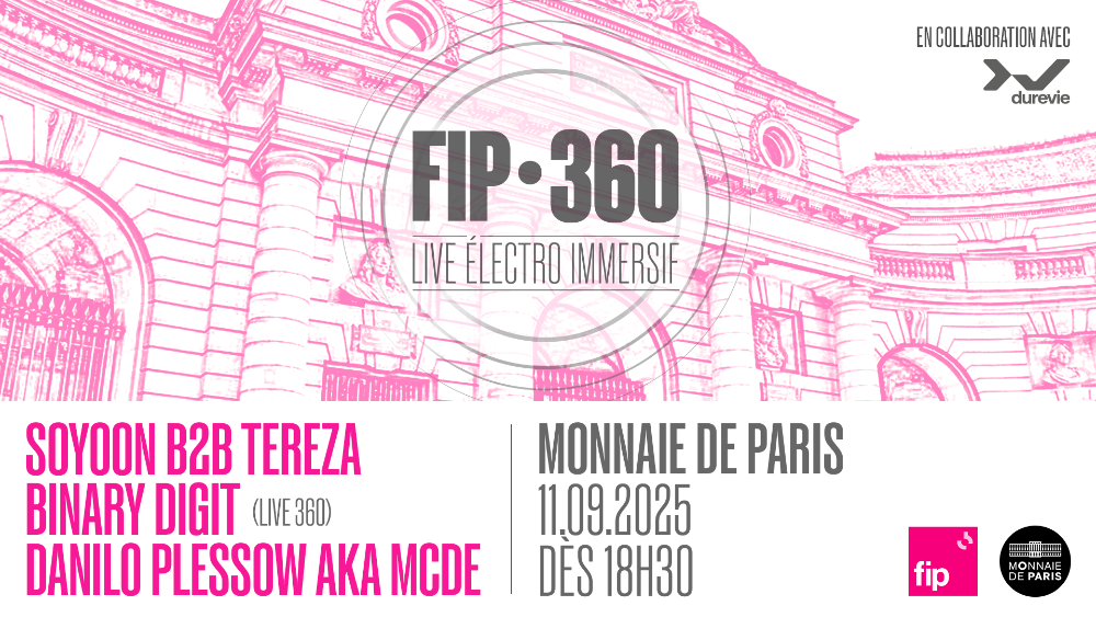 Devenu le rendez-vous électro incontournable de la rentrée, FIP 360 à la Monnaie de Paris revient le 11 septembre prochain et promet de transporter, encore une fois, son public dans une nouvelle dimension sonore. Une 4ème édition du live électro immersif qui s’annonce flamboyante en compagnie de Soyoon en back to back avec Tereza, Binary Digit en live 360 et Danilo Plessow aka MCDE !