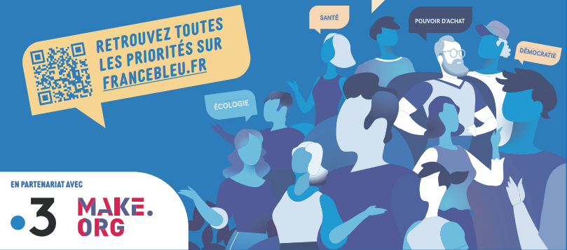 Entre le 25 août 2021 et le 10 mars 2022, l’Agenda Citoyen, résultat de la plus grande consultation citoyenne en ligne lancée par France Bleu, France 3 Régions et Make.org, met en avant 12 priorités, parmi 34 000 propositions qui ont réuni +1 million de participants et +7 millions de votes : c’est la plus grande consultation en ligne jamais menée par la société civile en France ! Cet Agenda Citoyen est l’aboutissement de cette grande consultation qui proposait à l’ensemble des citoyens de répondre à la question : « Quelles priorités pour notre pays demain ? ».