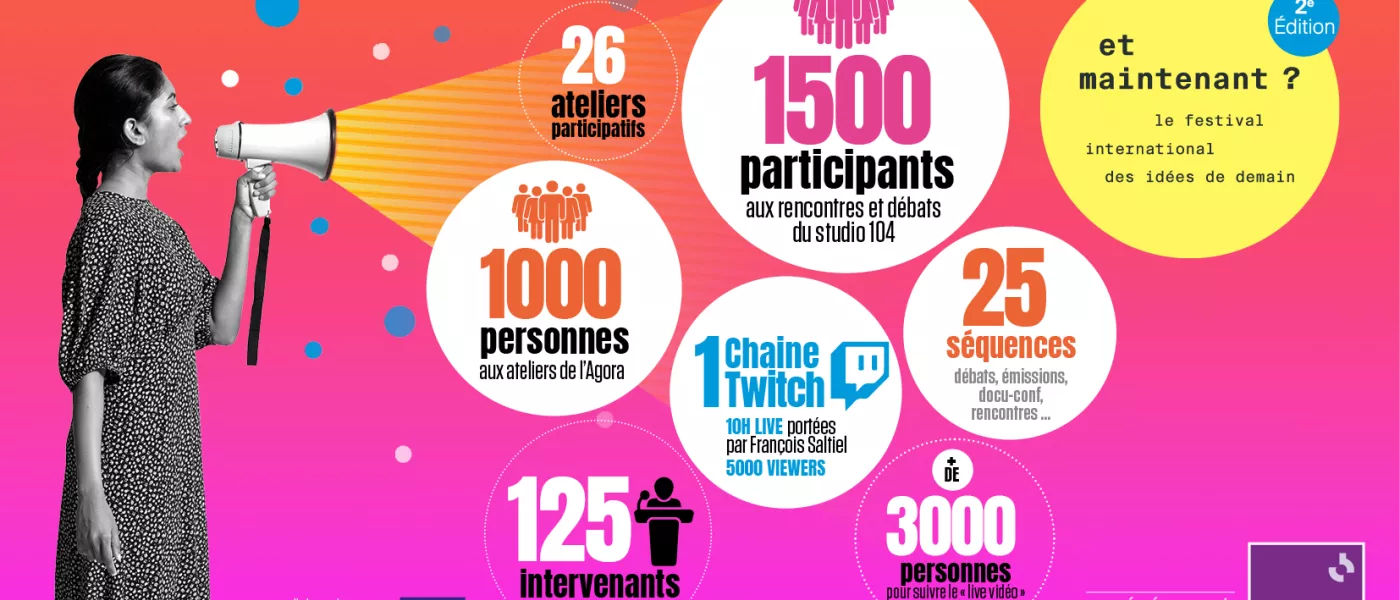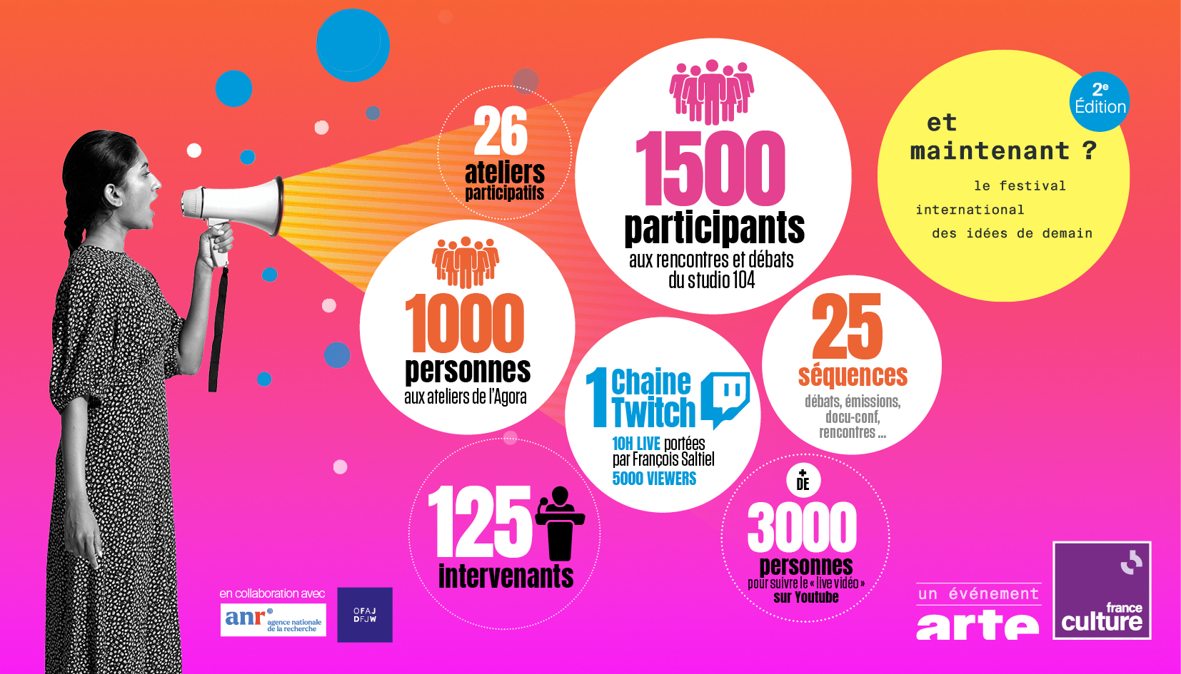 Plus de 1.500 participants sont venus assister aux rencontres et débats du studio 104 et plus de 1.000 personnes ont participé aux ateliers de la Maison de la Radio et de la Musique vendredi 21 et samedi 22 octobre dernier pour la deuxième édition de « Et maintenant ? », le festival international des idées de demain proposée par France Culture et ARTE, et soutenue par l’Agence nationale de la recherche (ANR) et l’Office franco-allemand pour la Jeunesse (OFAJ).