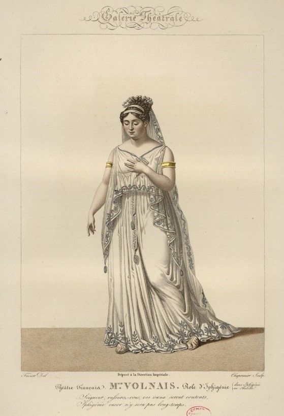 Crédits photo : Mlle Volnais, rôle d'Iphigénie (Iphigénie en Aulide) / Favart (dessinateur), Chaponnier (graveur), [1873], gravure en coul. Coll. Comédie-Française
