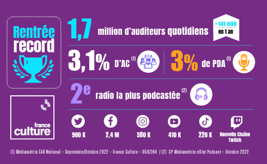 Avec une grille renouvelée et des programmes de référence installés, la rentrée 2022 est la plus écoutée de l’histoire de France Culture. Les auditeurs n’ont jamais été aussi nombreux durant les mois de septembre et octobre à suivre la radio grand public de la culture et de la connaissance.