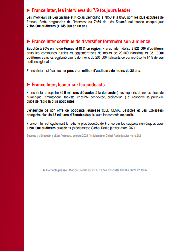 France Inter / 1re radio de France : Résultats Médiamétrie EAR Etude Audience Radio - National – Sept-Oct 2021 Publié le 18.11.2021 pdf