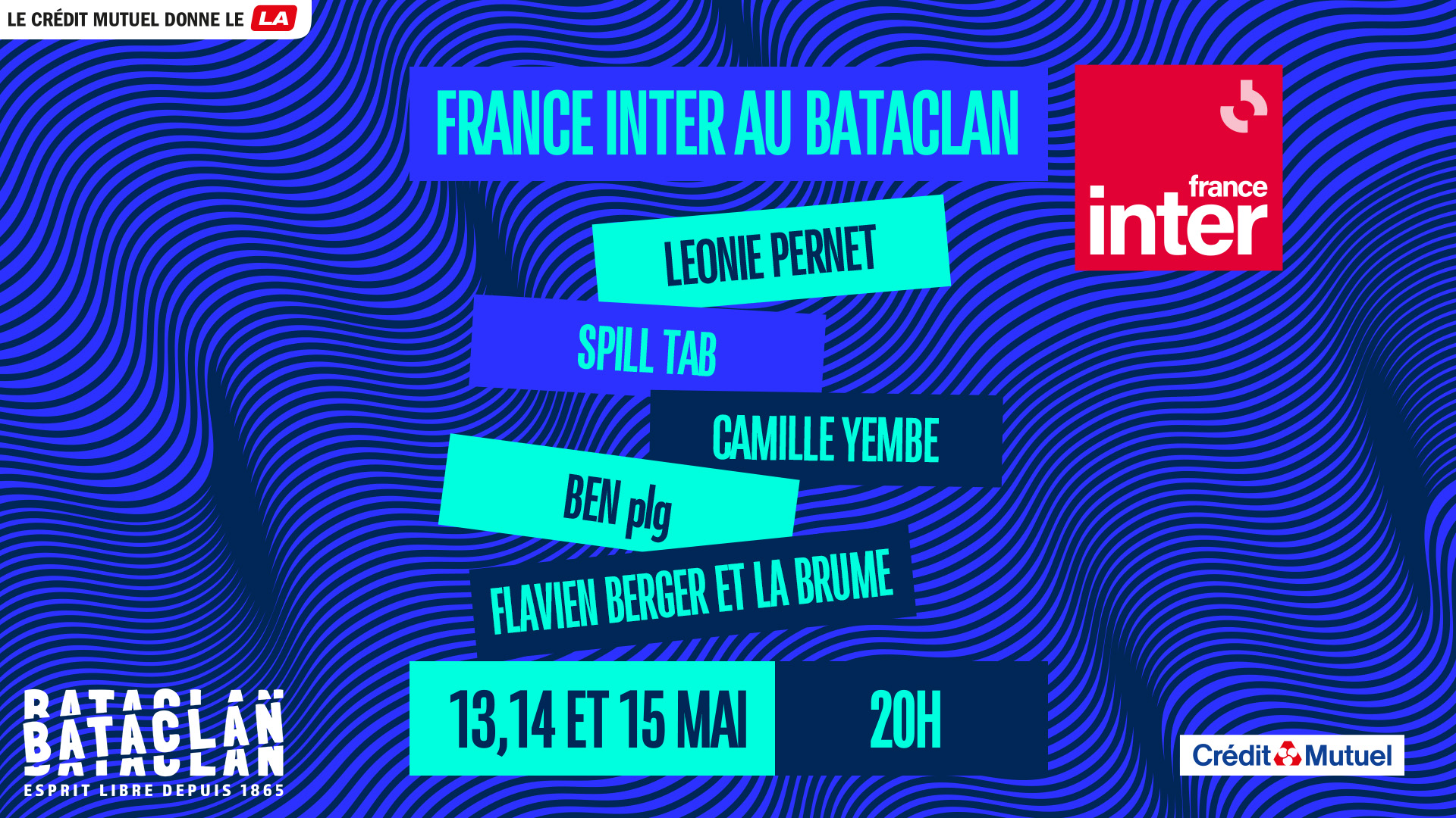 Comme chaque année, France Inter investit le Bataclan* pour trois soirées exceptionnelles et gratuites. Au programme : une sélection d’artistes émergents et confirmés issus des scènes pop, rap, électro et indépendantes, pour explorer la richesse des musiques actuelles.