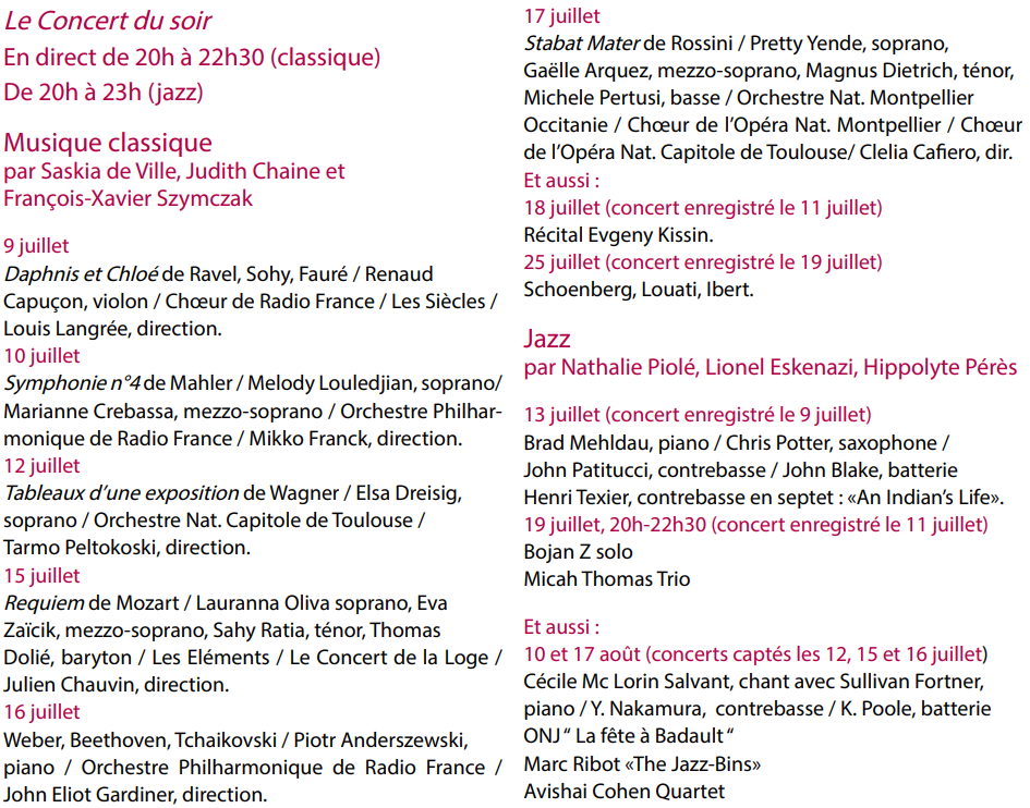 Également au programme, des émissions en public dans les Jardins de l’Hôtel de Girard : La Tribune des critiques de disques (enregistrée le 11 juillet, diffusée le 14 juillet) par Jérémie Rousseau autour du Concerto pour piano n°1 de Beethoven avec Valérie Chevallier directrice générale de l’Opéra Orchestre Montpellier Occitanie), Melissa Khong (journaliste à Pianiste et à Classica) et Christian Merlin (critique musical au Figaro, producteur sur France Musique), et une émission présentée par Saskia de Ville autour de l’Académie d’Orchestre du Festival pour découvrir la jeune génération portée par l’Orchestre Philharmonique de Radio France (enregistrée le 18 juillet, diff. 20 juillet). Les 11 et 12 juillet, Clément Rochefort présentera Musique Matin en direct de Montpellier.