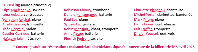 20 musiciennes et musiciens de jazz se produiront en direct de la scène du Studio 104 de la Maison de la Radio et de la Musique et sur France Musique le 25 avril prochain à 20h, à l’occasion des 40 ans de radio d’Alex Dutilh, le producteur d’Open Jazz sur France Musique, « Mister Institution » dixit Ahmad Jamal !