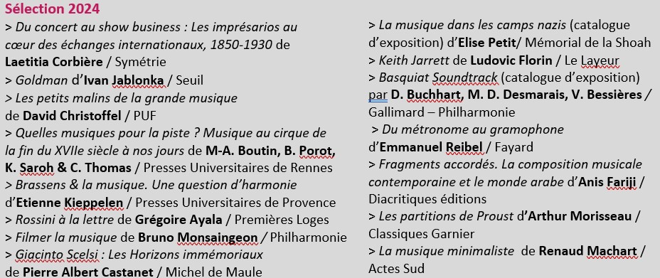 Composé de 9 personnalités du monde de la musique, le jury du Prix du Livre France Musique-Claude Samuel a dévoilé sa sélection de 15 ouvrages parmi 103 candidats. Ce prix récompense des livres publiés en 2023 et consacrés à la musique classique, au jazz, à la chanson et aux musiques traditionnelles 4 d’entre eux seront récompensés lors de la remise des prix le jeudi 25 avril à la Maison de la Radio et de la Musique. Les lauréats seront invités dans Relax ! chez Lionel Esparza.