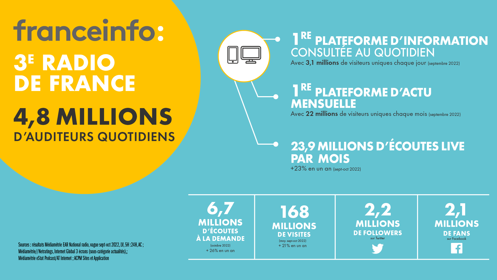 Le week-end, franceinfo réalise sa meilleure vague de rentrée et franchit le cap des 4 millions d’auditeurs quotidiens : 4 072 000 (+335 000 en un an).