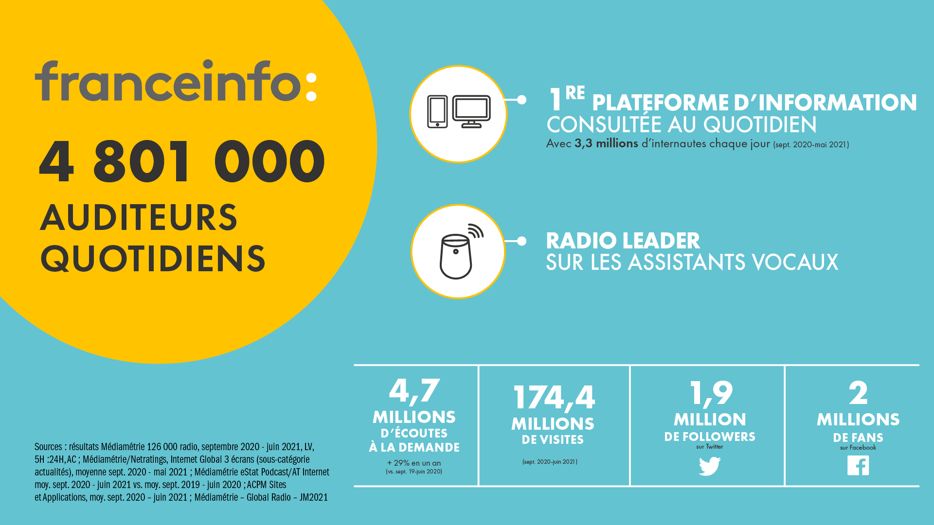 Avec une vague avril-juin 2021 en hausse (8,2% d’AC et 4 513 000 auditeurs quotidiens, soit +116 000 fidèles en un an), franceinfo signe une excellente année 2020-2021 et réalise ainsi sa meilleure saison depuis 15 ans. En progression sur tous les indicateurs, la chaîne rassemble 4 801 000 auditeurs chaque jour, soit 8,8% d’AC (+0,9 pt) et gagne +512 000 auditeurs en une saison. Avec une part d’audience record à 4,5% et une durée d’écoute en hausse à 61 minutes, franceinfo est la 3e radio de France sur la saison 2020-2021.