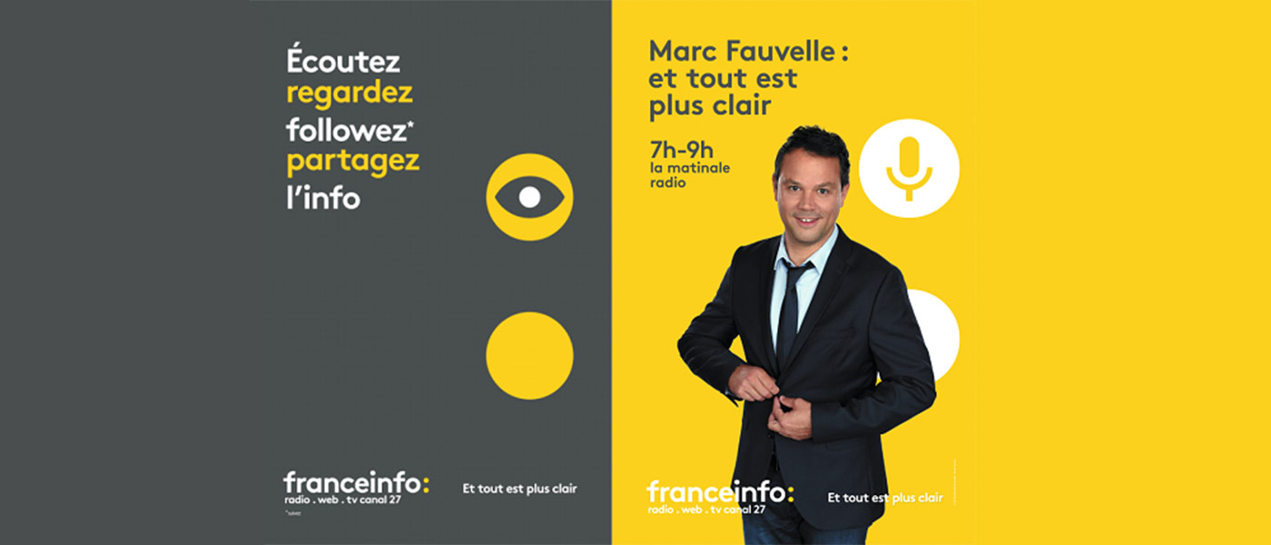 Pour sa 4ème rentrée en tant que média global, franceinfo affiche sa nouvelle signature « franceinfo : et tout est plus clair » signée par l’agence Movement. Ce nouveau slogan est le fruit d’une réflexion transverse entre les équipes de France Télévisions et celles de Radio France.