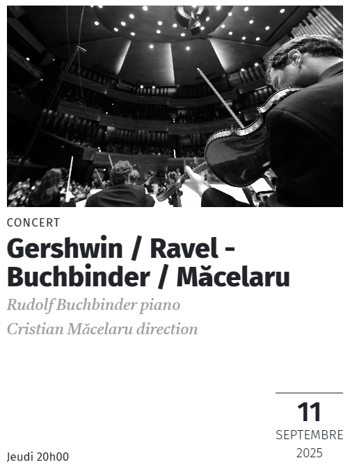 L'Orchestre National de France et son directeur musical Cristian Măcelaru ouvrent la saison des concerts de Radio France à l'Auditorium le jeudi 11 septembre avec le pianiste Rudolf Buchbinder pour le Concerto pour piano en fa majeur de George Gershwin, mais également La Valse et une version orchestrée du Trio avec piano de Maurice Ravel dans le cadre des célébrations des 150 ans du compositeur.