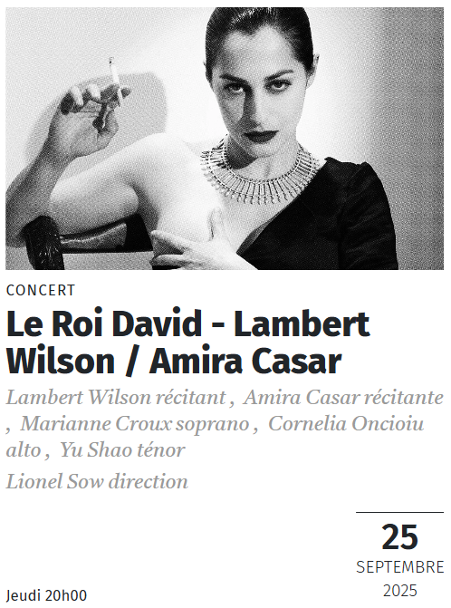 Enfin le Chœur de Radio France donne son premier concert de musique chorale de la saison avec Le Roi David d'Arthur Honegger le jeudi 25 septembre en compagnie des solistes de l'Académie de l'Opéra national de Paris, des Apaches ! et de Lambert Wilson et Amira Casar en récitants. On retrouvera également Sanctuaires, une création mondiale d'Othman Louati.