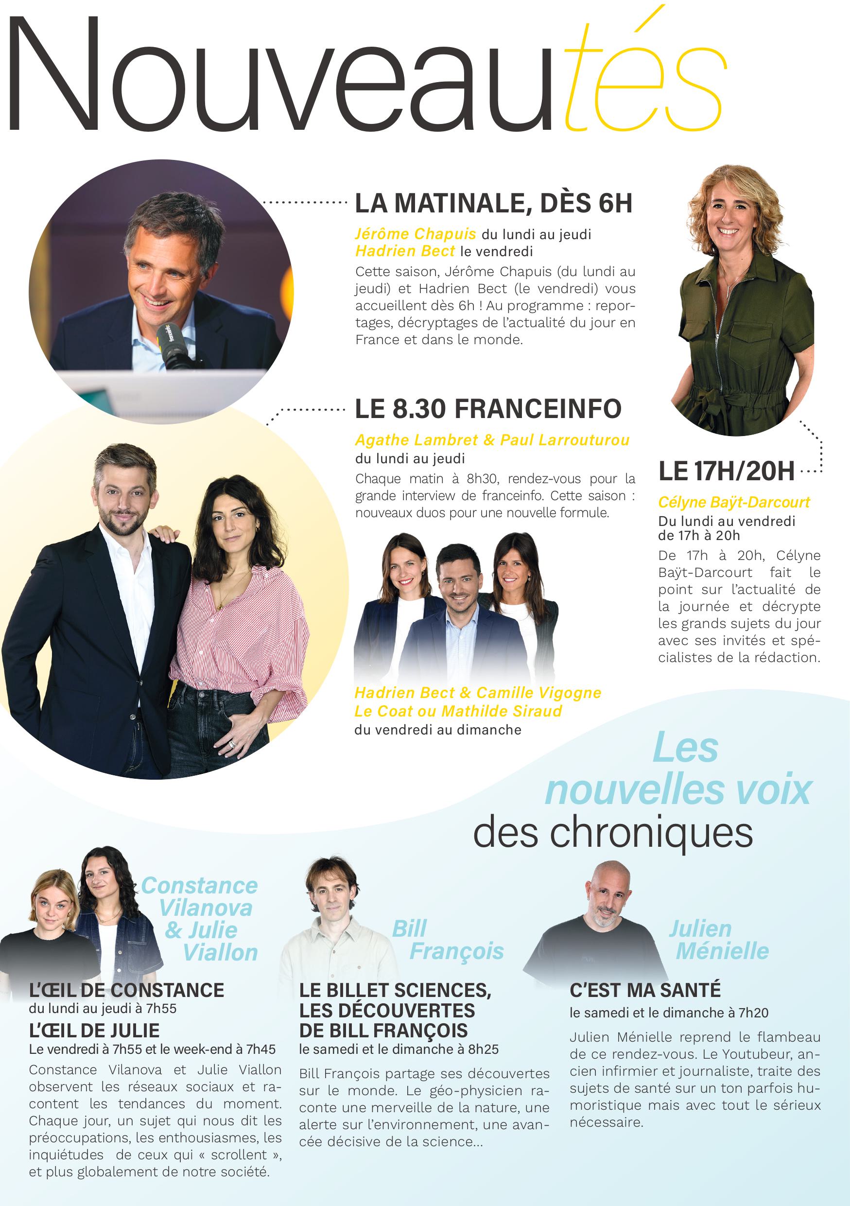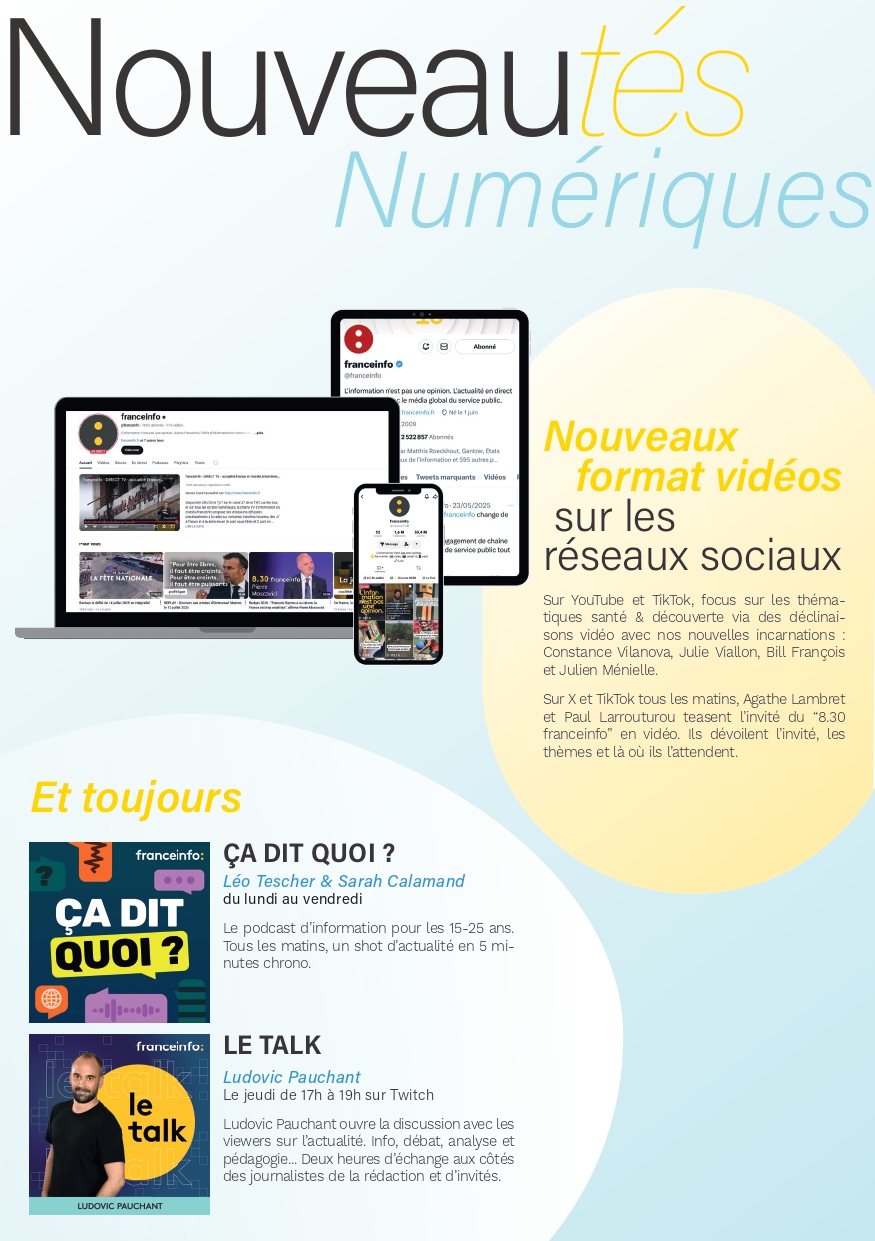 franceinfo garde un temps d’avance et cultive sa modernité avec des nouveaux rendez-vous : l’analyse des phénomènes sur les réseaux sociaux avec Constance Vilanova et Julie Viallon, la découverte qui fait avancer le monde avec le scientifique touche-à tout Bill François, les conseils santé de Julien Ménielle, et le rendez-vous immersif, j’ai testé pour vous d’Ingrid Pohu.