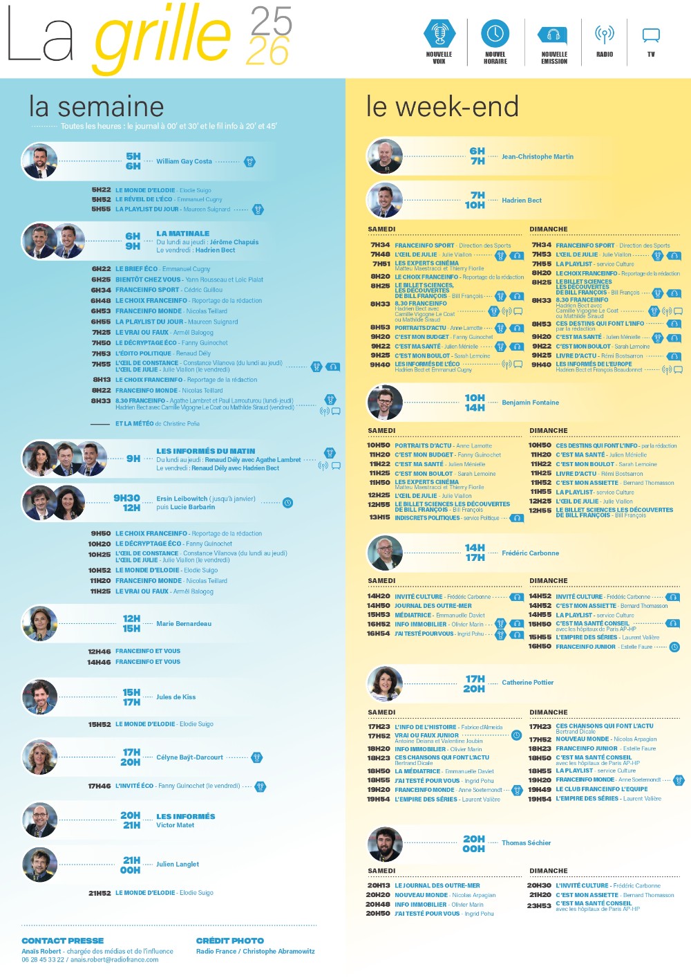 En cette rentrée, nous serons au rendez-vous de ceux qui se lèvent tôt : la matinale c’est désormais dès 6H ! Jérôme Chapuis, Hadrien Bect et leurs chroniqueurs nous réveillent avec efficacité et bienveillance, conscients que l’actualité peut être rude. La matinale laissera aussi plus de place au reportage, avec une hausse de 50% par rapport à la saison dernière. En fin de journée, Célyne Baÿt-Darcourt accompagne dès 17h nos auditeurs pour faire avancer et décrypter les grands sujets du jour.