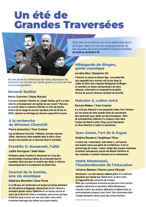 L’été est aussi ce moment rare où l’on peut s’arrêter, approfondir, se laisser surprendre. 80 ans après la fin de la Seconde Guerre mondiale, nos Grandes Traversées plongent dans le parcours de Staline, Churchill et Roosevelt - les trois protagonistes de la conférence de Yalta - et la bombe atomique interroge elle-même son propre destin dans une série événement.