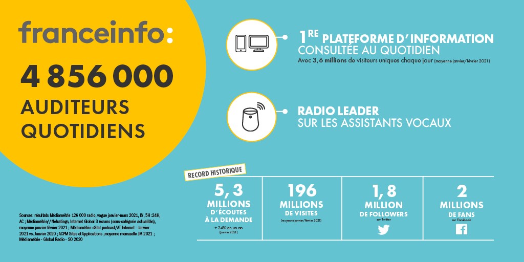 franceinfo confirme sa place de 3e radio la plus écoutée de France sur la vague janvier-mars 2021. La chaîne rassemble 4 856 000 auditeurs chaque jour et gagne plus de 800 000 fidèles en un an (+20%). Avec 8,9% d’A.C. (+1,5 pt en un an) et une part d’audience en hausse à 4,4%, franceinfo est la seule radio à progresser autant en un an.