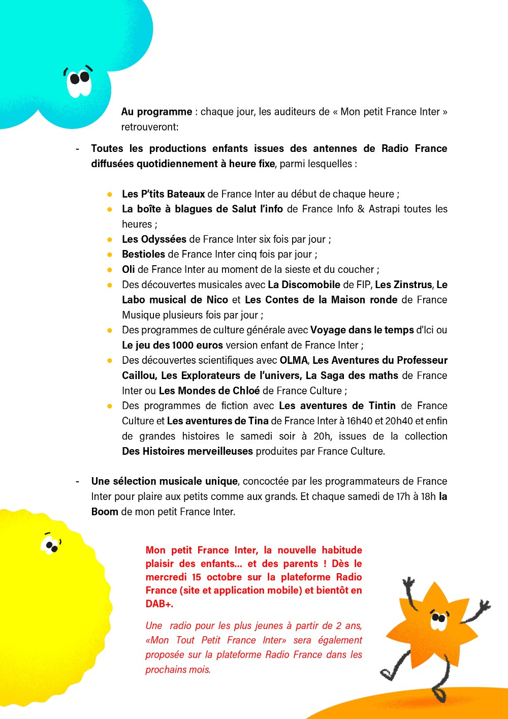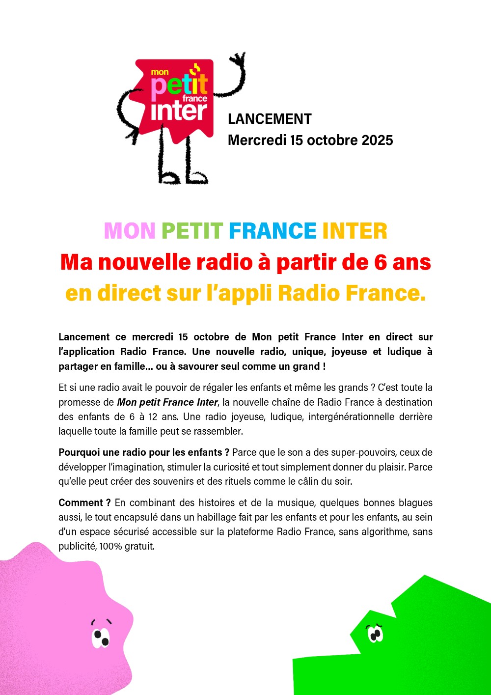 Mon Petit France Inter : ma nouvelle radio à partir de 6 ans en direct sur l’appli Radio France Publié le 15.10.2025 Radio France ÉCOUTEZ-LÀ ICI Contact presse : Lucas HERAL pdf primp15827.pdf