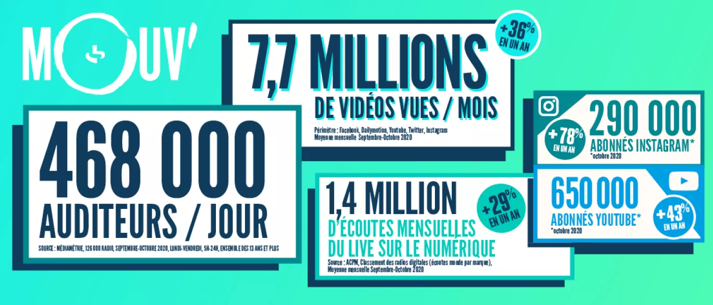 Mouv' enregistre également d'excellents résultats sur les réseaux sociaux avec une communauté croissante et engagée. Elle fédère 650 000 abonnés sur YouTube, soit 43% de plus en un an et 290 000 abonnés sur Instagram, soit une hausse de 78% par rapport à l'année dernière.**
