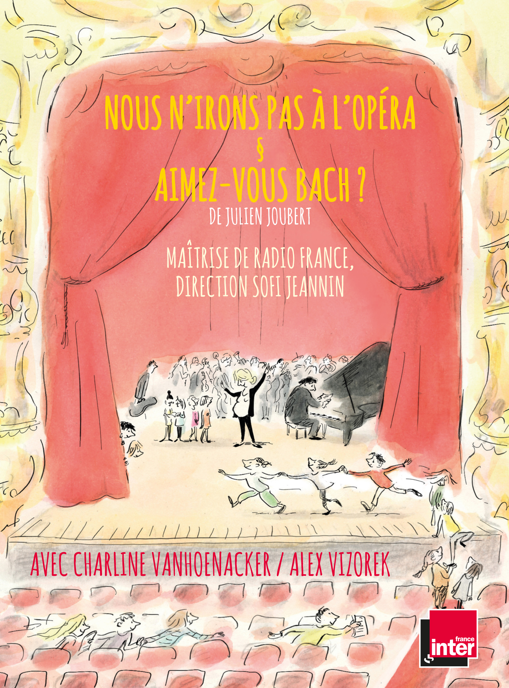 Commandes de l’Académie musicale de Villecroze, avec le soutien de la fondation Carasso, et en partenariat avec le Ministère de l’Éducation Nationale, de l’Enseignement Supérieur et de la Recherche et le Réseau Canopé, Nous n’irons pas à l’opéra et Aimez-vous Bach ont été enregistrés au Studio 104 de Radio France par la Maîtrise de Radio France avec les voix des deux humoristes de France Inter, Charline Vanhoenacker et Alex Vizorek, et Justin Taylor (clavecin), Julien Joubert (piano), Hélène Collerette (violon), Jean-Luc Bourré (violoncelle), Yann Dubost (contrebasse), Jérôme Voisin (clarinette), Aude Richard-Camus (clarinette), Philippe Hanon (basson).