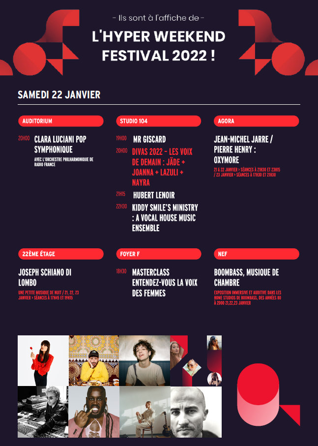 La Maison de la Radio et de la Musique vous accueille les 21, 22, 23 Janvier 2022 pour l’Hyper Weekend, son tout premier festival de musiques actuelles ! Né d’une volonté de Radio France de renforcer son engagement historique pour les artistes et l’ensemble du secteur musical, le festival tiendra sa promesse malgré le contexte actuel : un événement où la scène française, la création et la rencontre des genres seront à l’honneur. Il vivra aussi sur nos antennes en direct ou en rediffusion pour que le plus grand nombre puisse en bénéficier.