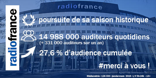 France Musique réalise 1,8% d’A.C., en progression de 0,2 pt. La chaîne atteint 964 000 auditeurs, soit une progression de 81 000 auditeurs en un.