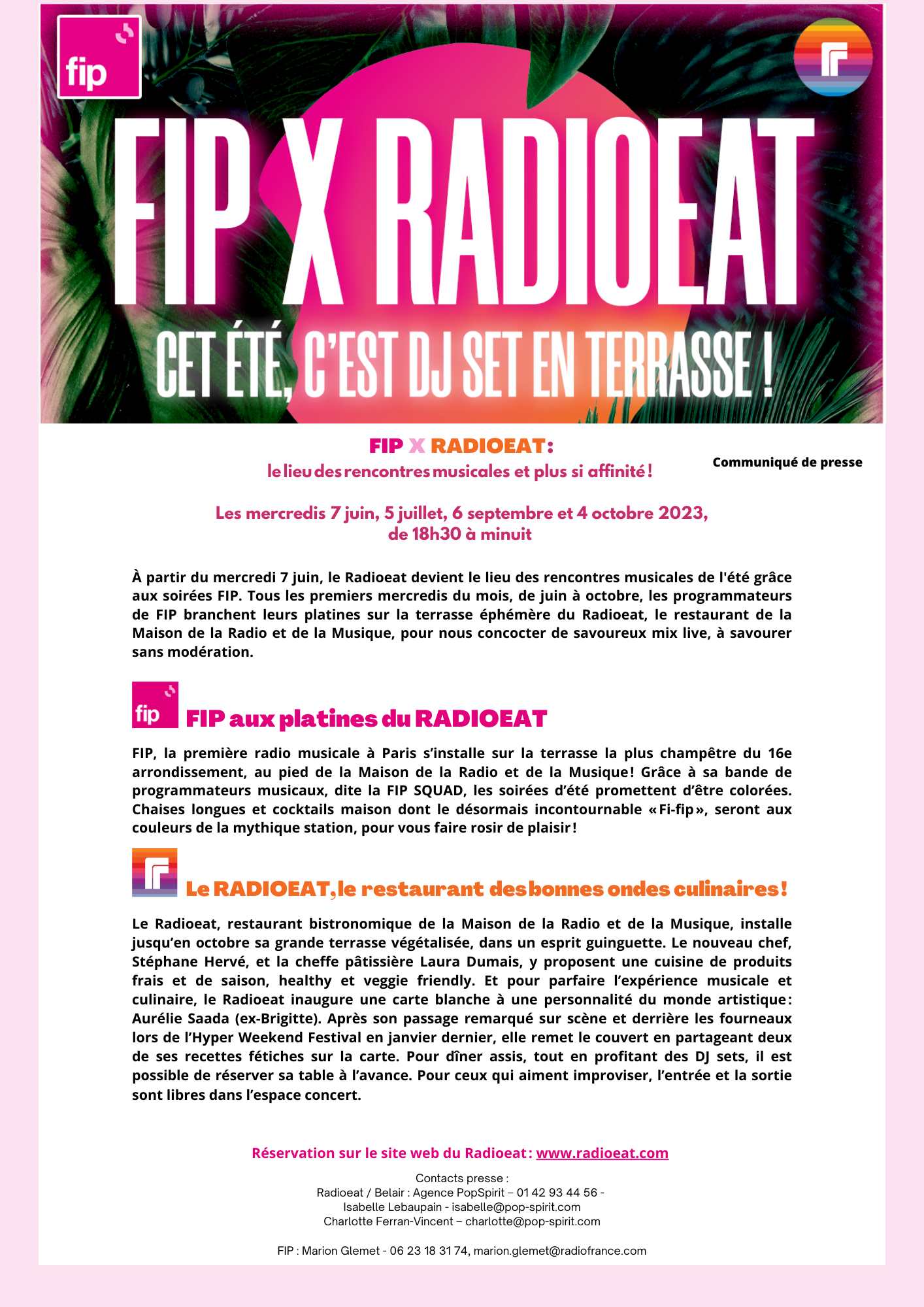 À partir du mercredi 7 juin, le Radioeat devient le lieu des rencontres musicales de l'été grâce aux soirées FIP. Tous les premiers mercredis du mois, de juin à octobre, les programmateurs de FIP branchent leurs platines sur la terrasse éphémère du Radioeat, le restaurant de la Maison de la Radio et de la Musique, pour nous concocter de savoureux mix live, à savourer sans modération.