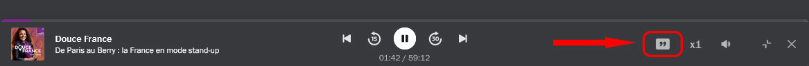 Pour lire la transcription d’une émission, il suffit de cliquer sur l’icône de guillemets (encadré rouge sur l'exemple visuel ci-dessous) une fois le player audio lancé.